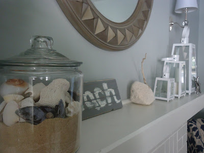 The little "beach" sign came from Mr. Fix-it's workshop. I journeyed down into the "man cave" aka...dark, dirty, tool-filled work room, to find something to make a sign with. I found a random plank and had Mr. Fix-it cut it to the length I needed. I gave it a quick paint and wrote "beach" on it with Benjamin Moore Cloud White. A quick sand to make it look a bit "weathered" and VOILA...a summer sign.